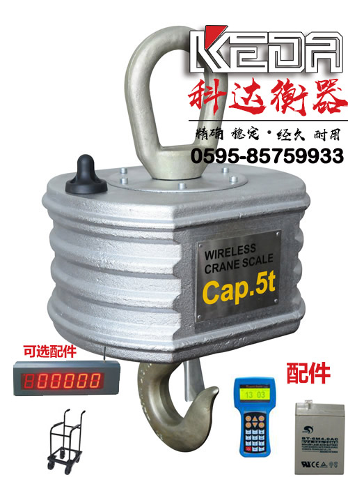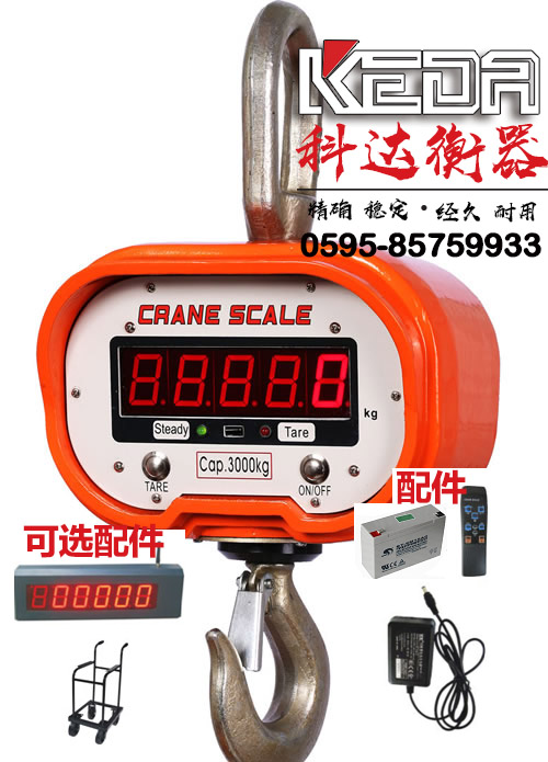 福建科達衡器有限公司所設計生產的南平吊鉤秤按照數值顯示的形式可以分為無線數傳型電子吊鉤秤(1-50噸)和直視型電子吊鉤秤;其中直視型電子吊鉤秤又可以分為高溫耐熱型電子吊鉤秤(1-30噸),防爆電子吊鉤秤(1-50噸)、高精度電子吊鉤秤(1-50噸)、便攜式電子吊鉤秤(0.1t~1t)、掌上型電子吊鉤秤(手掌稱 30kg~300kg)等;按照量程來分又可以分為:1噸吊鉤秤、2噸吊鉤秤、3噸吊鉤秤、5噸吊鉤秤、10噸吊鉤秤、15噸吊鉤秤、20噸吊鉤秤、30噸吊鉤秤、40噸電子吊鉤秤、50噸電子吊鉤秤。福建科達衡器所生產的南平電子吊鉤秤均配有電子吊鉤稱專用電池和專用充電器,均可選配無線大屏幕和小推車。